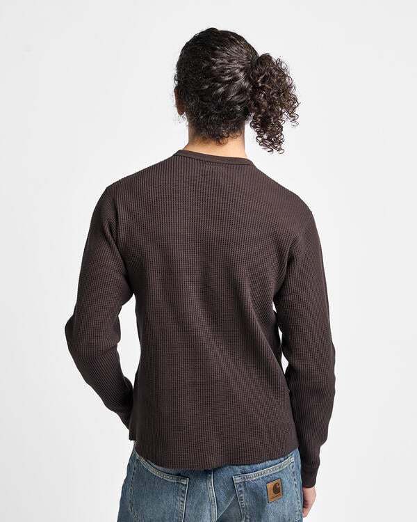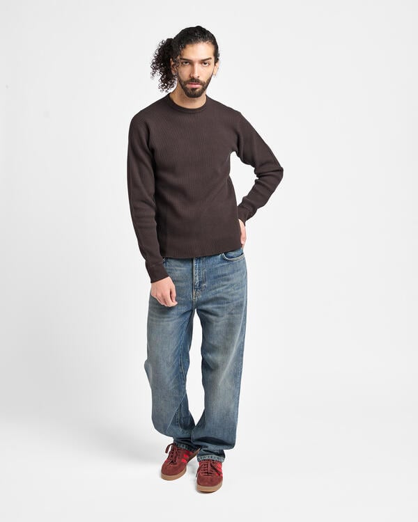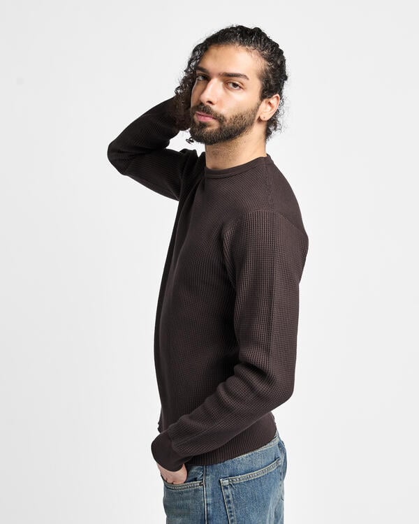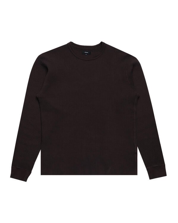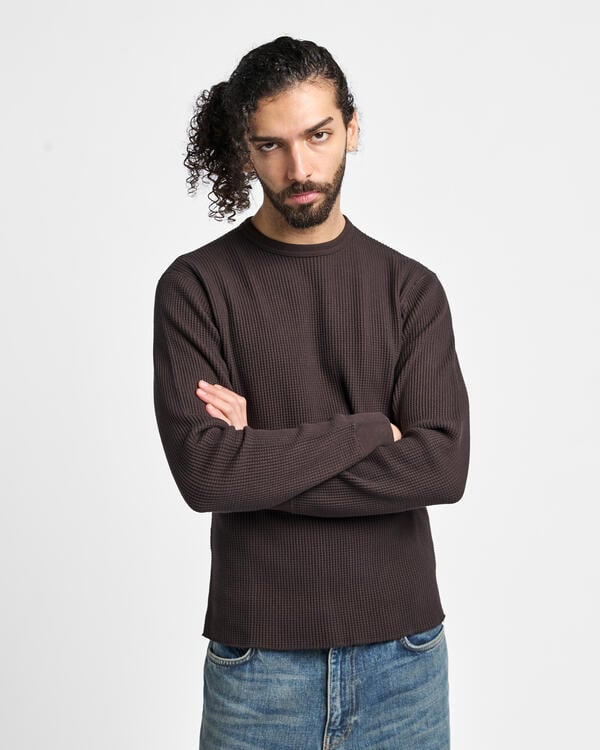 Ein langärmeliges Shirt mit Rundhalsausschnitt aus Waffelgewebe, das in Japan hergestellt und genäht wird. Es hat genau die richtige Dicke und einen festen Griff, der ihm auch beim alleinigen Tragen ein starkes Finish verleiht.