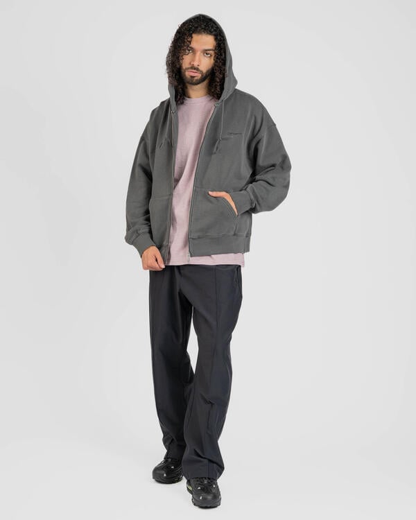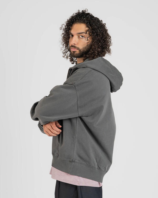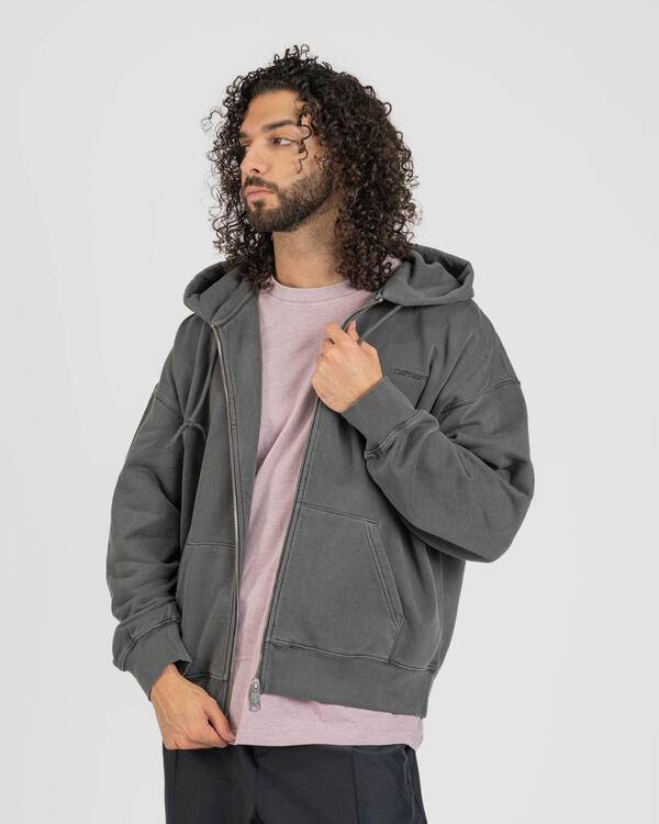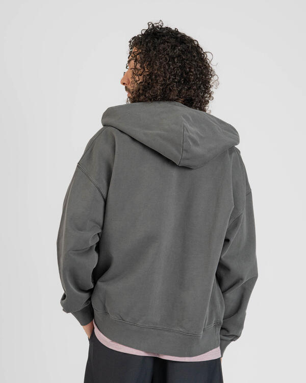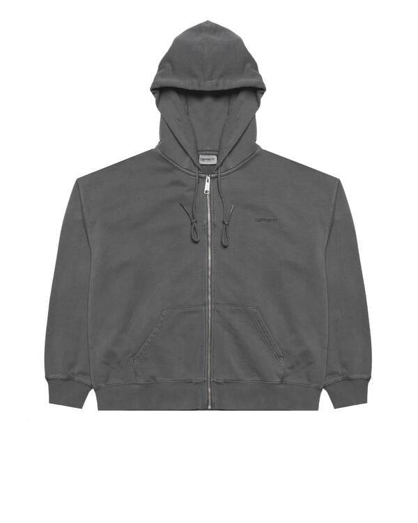 The loose and boxy Hooded Benton Sweat Jacket is made from unbrushed, heavy cotton jersey that has been piece-dyed for a softer feel and more complex coloration. The style features an adjustable hood and a kangaroo pocket. An embroidered script logo completes the look.