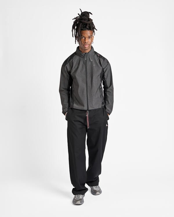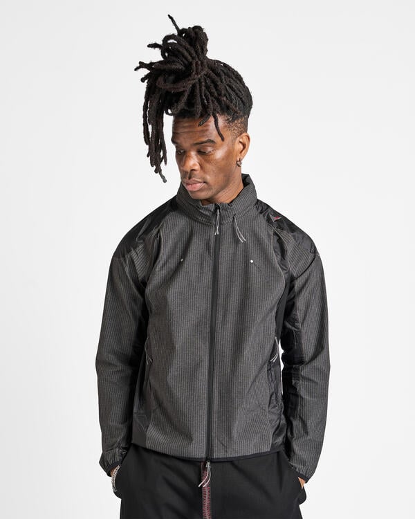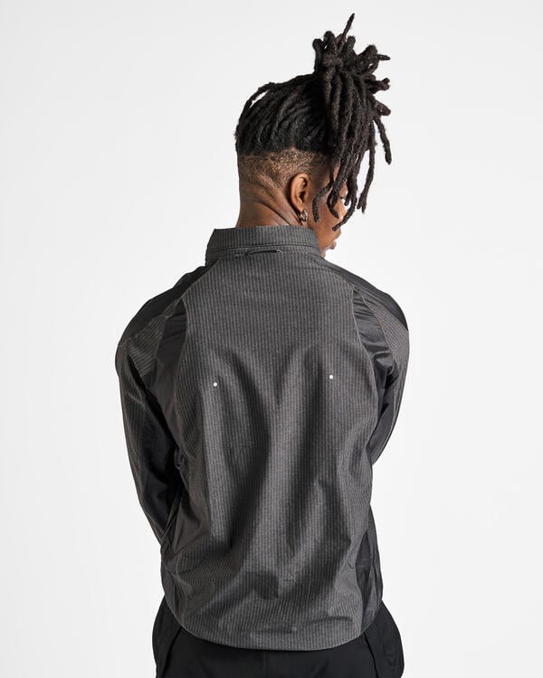 Die Numb Pinstriped Hooded Wind Jacket ist eine leichte, winddichte Jacke in schwarzer Farbe mit Nadelstreifen. Sie ist aus Stretch-Nylon mit kontrastierenden 40D-Nylon-Einsätzen gefertigt und kombiniert Schutz mit Flexibilität. Die Jacke verfügt über eine verstaubare Kapuze, unsichtbare Reißverschlusstaschen auf der Vorderseite und Bündchen an Ärmeln, Saum und Kapuze für einen sauberen, sicheren Abschluss. Reflektierende Punkte und Zickzack-Steppnähte sorgen für Sichtbarkeit und Struktur. Die Jacke hat eine normale Passform und ist mit einem gestickten ROA-Logo auf der linken Schulter versehen.
